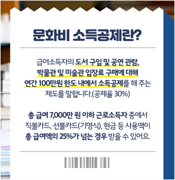 | 공제율 | 도서·공연·박물관·미술관 등 문화비 30% 추가공제 구조 |