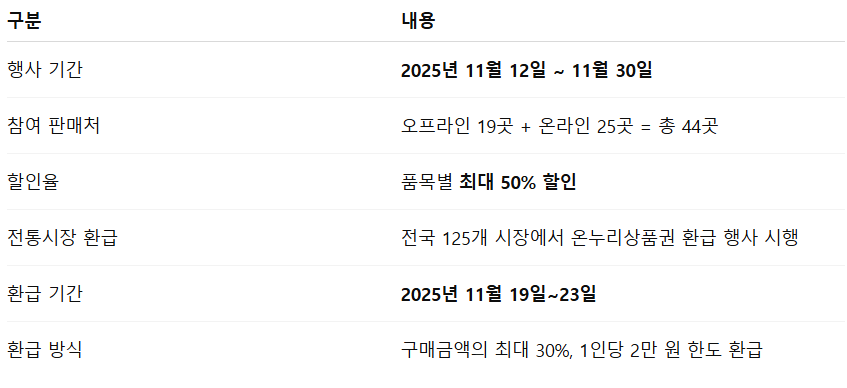 대한민국 수산대전은 매년 계절별로 진행되는 정부 공식 수산물 소비촉진 행사이며, 특히 김장철에는 천일염·새우젓·멸치액젓 등 핵심 재료를 중심으로 큰 폭의 할인이 제공되어 관심이 집중됩니다. 저는 지난해 김장 준비를 하면서 재료 가격이 높아 부담을 느꼈던 경험이 있어, 올해는 행사 일정과 할인폭을 미리 확인하고 구매 계획을 세우고 있습니다. 소비자들은 이번 행사에서 무엇이 얼마나 할인되는지, 전통시장 환급은 어떻게 받는지, 참여 판매처는 어디인지 등을 가장 궁금해합니다. 이 글에서는 2025년 11월 12일부터 30일까지 진행되는 김장철 수산물 할인 행사와 전통시장 온누리상품권 환급 혜택을 정리하고, 행사 활용 노하우까지 표 기반으로 자세히 안내합니다.