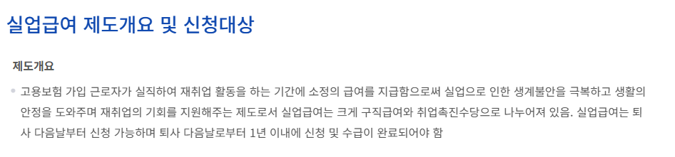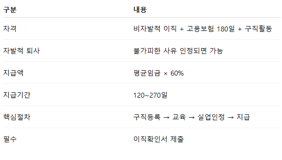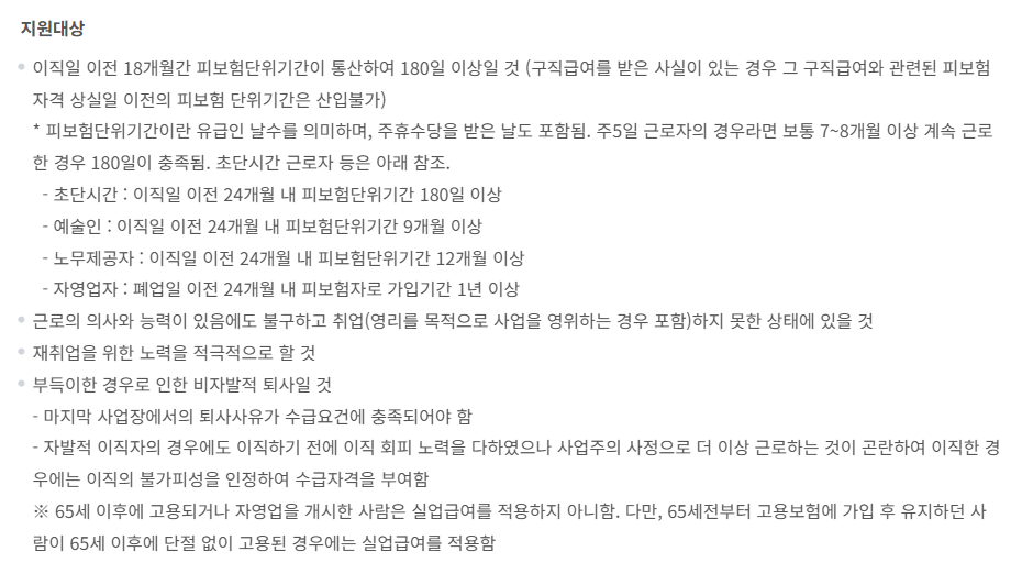 자세한 내용은 고용보험 사이트 실업급여 제도 안내에서 상세 조건 확인이 가능합니다.