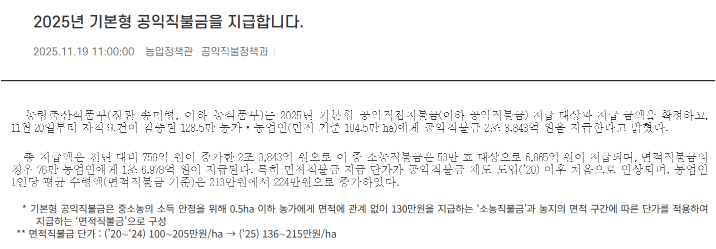 특히 올해는 기본형 공익직불금을 중심으로 여러 세부 직불이 개편되었고, 전략작물 직불 확대 적용도 이어지고 있어 미리 정보를 확인해두면 지급 누락을 예방할 수 있습니다. 이 글에서는 2025 농업 직불금 지급시기를 한눈에 확인하고, 신청·조회·검증까지 한 번에 따라갈 수 있도록 체계적으로 정리했습니다.