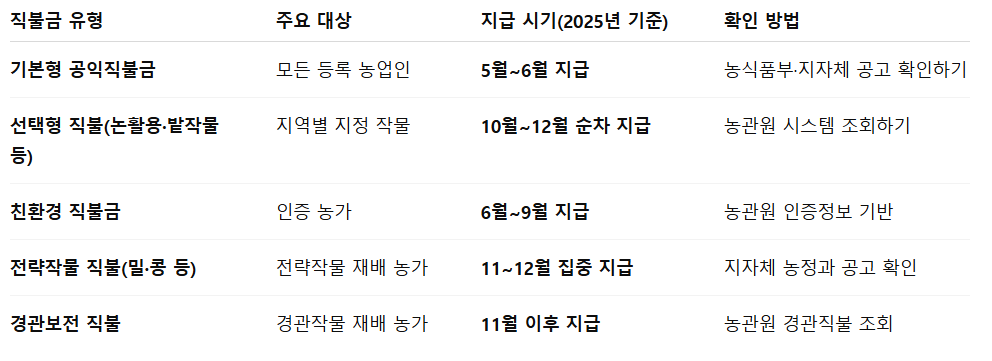 아래 표는 올해 정부가 밝힌 주요 직불금 지급 시기 기준이며, 지자체별 공고 일정에 따라 차이가 있습니다.
