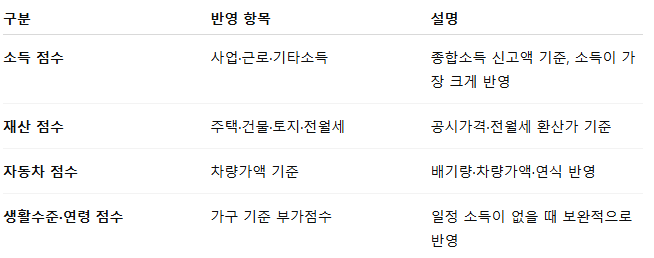 보험료 = (소득 + 재산 + 자동차 + 생활수준·연령 점수) × 점수당 금액