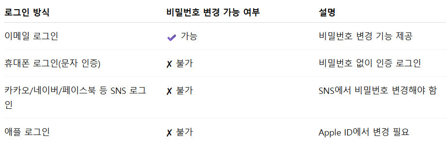 📌 [표 1] 쿠팡 로그인 방식별 비밀번호 변경 가능 여부