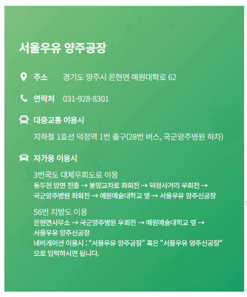 서울우유 양주공장은 우유·발효유·가공유 등 다양한 제품의 제조 과정을 견학 프로그램을 통해 공개하고 있습니다. 또한 공정별 위생관리 기준과 작업 공정 설명이 함께 제공되어 어린이·청소년 교육용으로도 활용도가 높습니다.