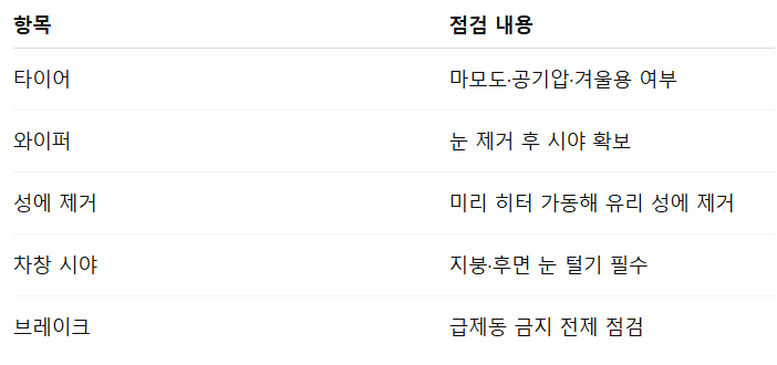 눈이 쌓인 채로 주행하면 급정거 시 더 미끄러워지므로 반드시 제거해야 합니다.