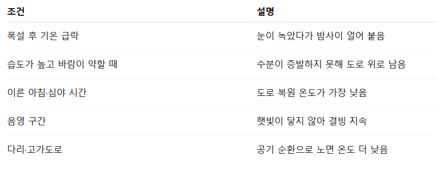 📌 [표 1] 블랙아이스 발생 위험 조건