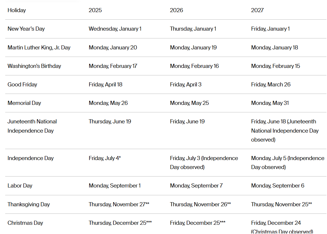 → 아니며 해마다 약간씩 다릅니다. NYSE/NASDAQ 공식 캘린더를 반드시 확인해야 합니다.