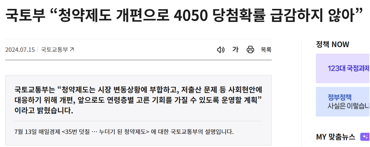 국토교통부는 “청약제도는 시장 변동상황에 부합하고, 저출산 문제 등 사회현안에 대응하기 위해 개편, 앞으로도 연령층별 고른 기회를 가질 수 있도록 운영할 계획”이라고 - 정책브리핑 | 브