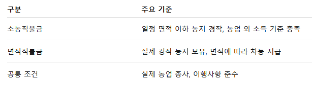 소농직불금은 소규모 농업인의 소득 안정을 목적으로 하며, 면적직불금은 경작 면적에 따라 지급 단가가 달라지는 구조입니다.
