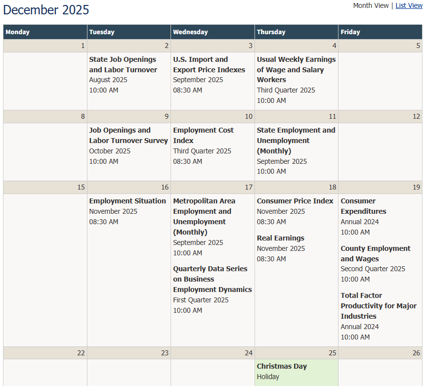 11월 고용지표는 12월 16일, 11월 CPI는 12월 18일 발표 확정