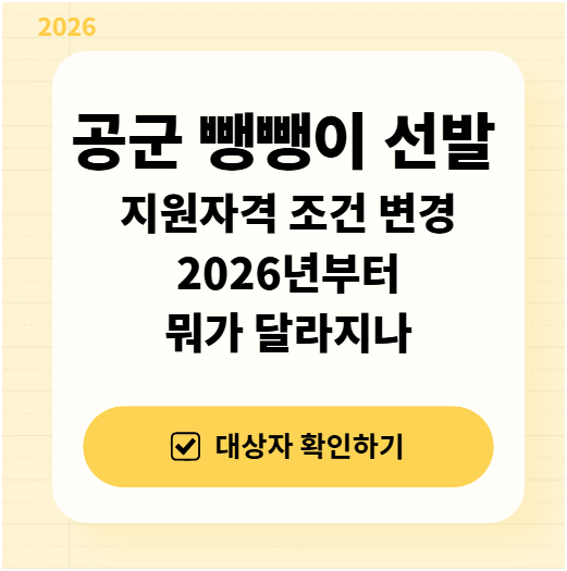 내년부터 공군 일반병 선발 방식이 기존 점수제에서 이른바 ‘뺑뺑이’로 불리는 무작위 전산 추첨 방식으로 바뀌면서 지원자들의 관심이 빠르게 높아지고 있습니다. 특히 “이제 자격증이 없어도 되는지”, “누가 지원할 수 있는지”, “조건은 달라졌는지” 같은 현실적인 질문이 많아진 상황입니다. 이 글에서는 공군 뺑뺑이 선발 제도의 핵심 변화와 지원자격·조건을 중심으로, 지원 전 반드시 확인해야 할 내용을 정리합니다.