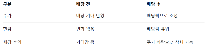 배당 기준일과 함께 반드시 알아야 할 개념이 배당락일입니다. 이 두 날짜의 차이를 표로 보면 훨씬 명확해집니다.