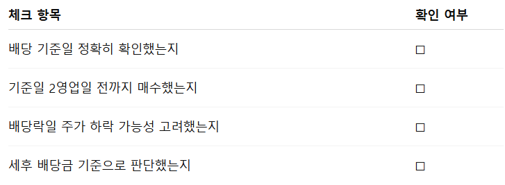 이 체크리스트만 확인해도, 배당 기준일 착각으로 인한 손해를 상당 부분 줄일 수 있습니다.