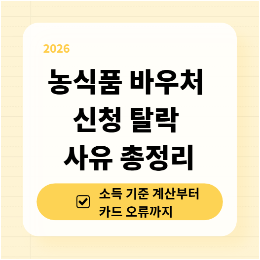 작년에 주변에서 농식품 바우처를 신청했다가 “왜 안 되는지 모르겠다”는 얘기를 자주 들었습니다. 기준을 대충 알고 넘어가면 탈락하거나, 받아놓고도 제대로 쓰지 못하는 경우가 생각보다 많습니다. 아래는 농식품 바우처 신청 탈락 사유를 소득 기준 계산부터 카드 오류까지 정리하고 해결책을 작성해봤습니다.