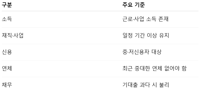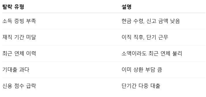 소득이 있어도 연체 이력이 있거나, 신용이 낮아도 기대출이 많으면 탈락할 수 있습니다.