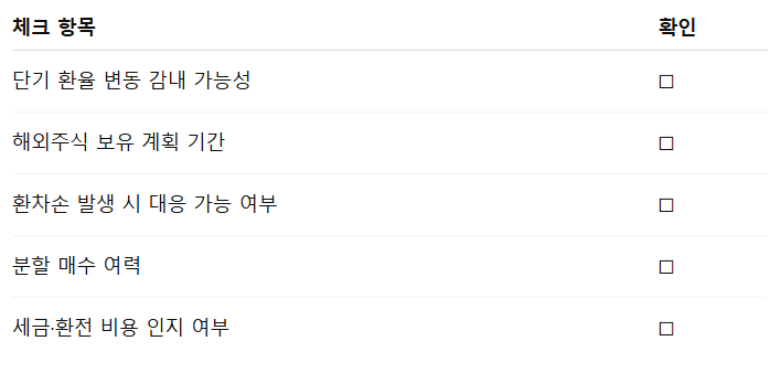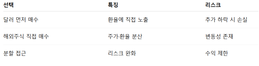 현재처럼 환율이 급락한 직후에는, 달러 단독 매수보다 해외주식을 통한 간접 노출이 오히려 안정적인 선택이 될 수 있습니다.