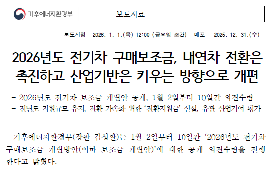 이 링크는 기후에너지환경부 공식 누리집의 보도자료 게시판으로 연결됩니다. 이번 2026년 보조금 개편안의 상세 배경과 함께 2027년까지 예고된 전액 지원 가격 기준 하향 조정(5,300만 원 → 5,000만 원) 등 정부의 중장기 로드맵을 직접 확인하실 수 있습니다.
