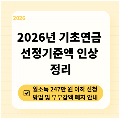 안녕하세요! 2026년 새해를 맞아 보건복지부에서 기초연금 수급을 위한 선정기준액을 대폭 상향했다는 기쁜 소식을 전해드립니다. 올해부터는 노인 단독가구 기준으로 월 소득인정액이 247만 원 이하이면 매달 기초연금을 받으실 수 있습니다.