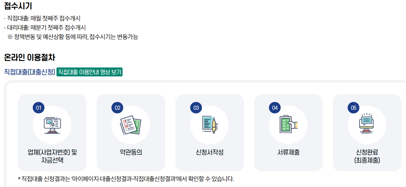 - 대리대출: 공단에서 확인서를 발급받은 후 시중 은행에서 대출을 실행하는 방식으로, 정부의 이차보전 혜택을 통해 시중보다 낮은 금리를 적용받습니다.
