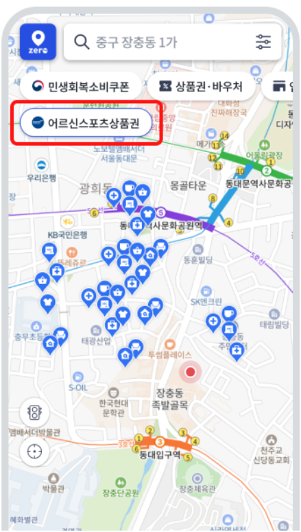 제로페이 앱에서 ‘가맹점 찾기 → 스포츠상품권 사용처’를 검색하면 주변 체육시설이 지도에 표시됩니다.