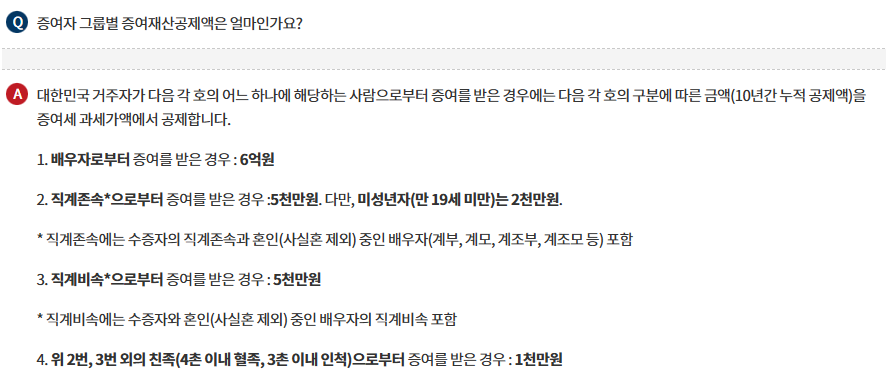 부모 → 성인 자녀(만 19세 이상)의 경우: 10년 단위로 최대 5,000만 원까지 증여세 면제