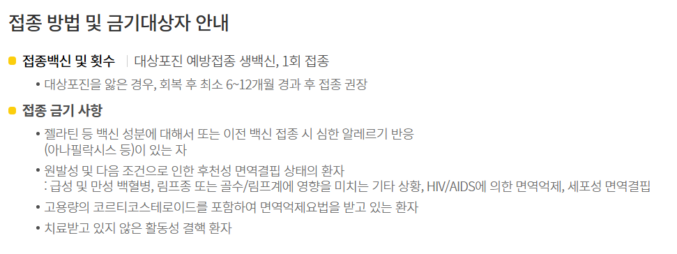 면역억제 치료 중이거나 혈액질환이 있는 경우, 해당 접종이 금기시 되는 경우가 있으므로 의사와 상담이 필요합니다.