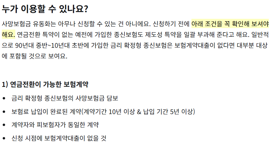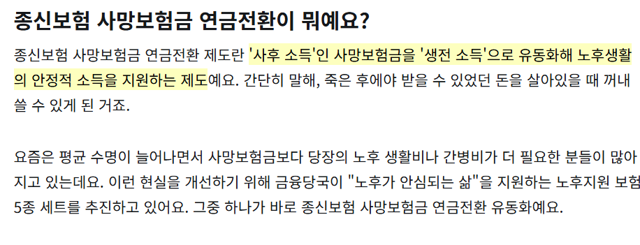 이에 따라 보험업계는 일정 납입기간 이후 보험계약자가 사망보험금을 연금형 소득으로 전환할 수 있는 선택권을 제공하고 있습니다.