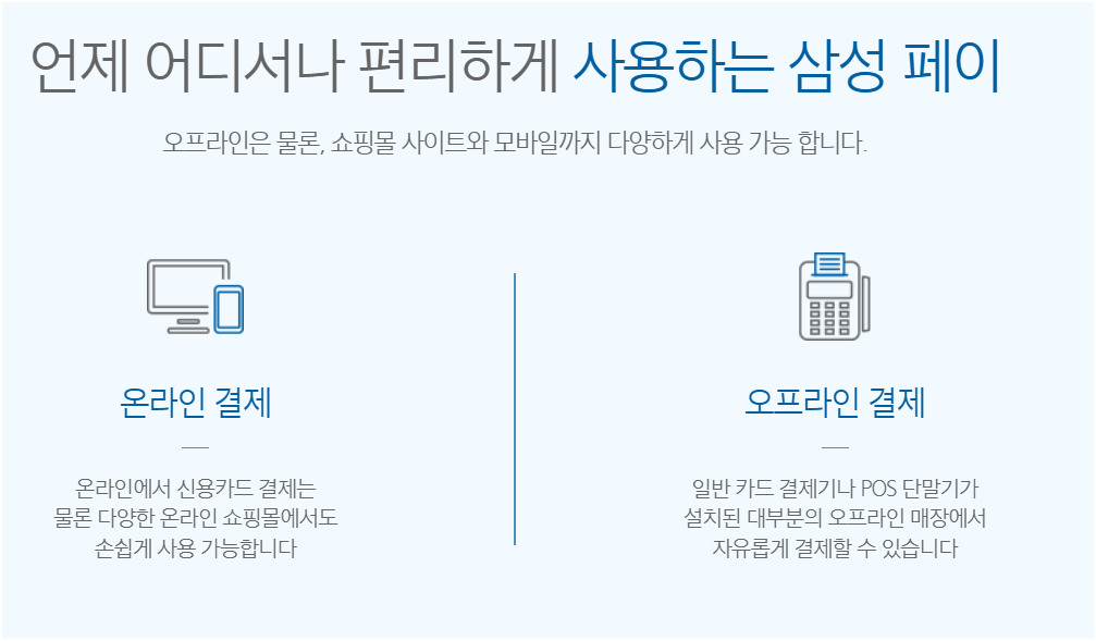 온라인 결제: 삼성페이 결제창에서 카드 선택 후, 생체인증만 하면 결제가 완료됩니다.