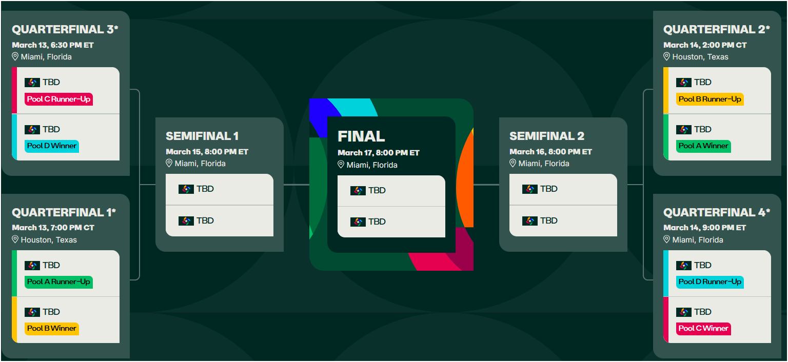 8강은 3월 12~13일, 준결승은 3월 15일, 결승전은 3월 17일(현지시간)로 예정되어 있습니다.