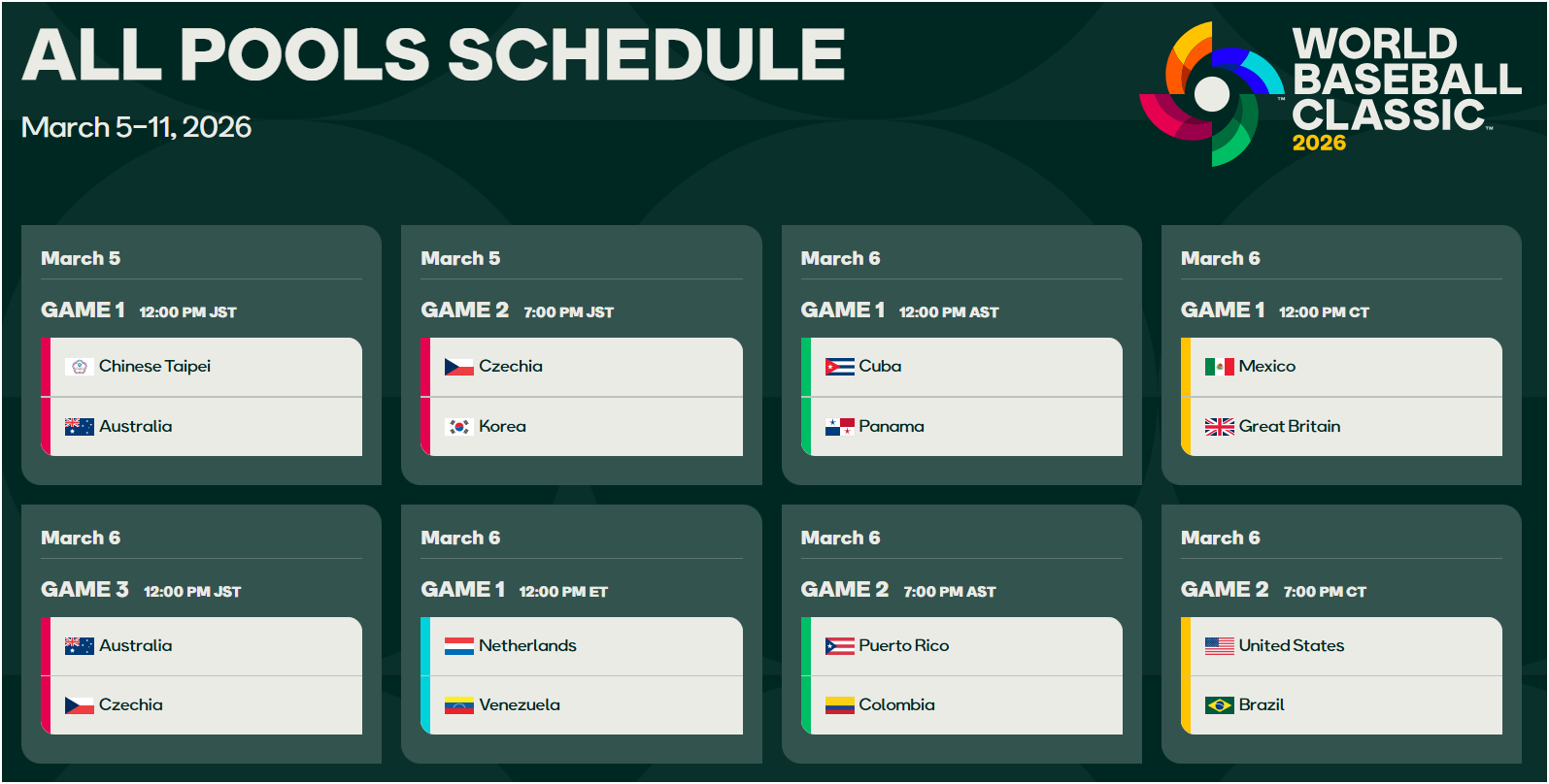 조별리그는 2026년 3월 5일 개막하며, 각 조별 경기 일정은 3월 10일까지 진행됩니다.